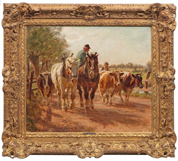 Für Junghanns in Motiv und Stil charakteristisches Gemälde. Der von Heinrich von Zügel ausgebildete, impressionistische Tiermaler, der seit 1904 an der Düsseldorfer Akademie lehrte, wandte sich in seinem Oeuvre insbesondere ländlichen Arbeits- und Nutztieren zu. Darstellungen von Bauern mit Zugtieren und Hirten bilden den Schwerpunkt seines Oeuvres. Öl/Lwd.; L. u. sign.; 50 cm x 60 cm. Rahmen.