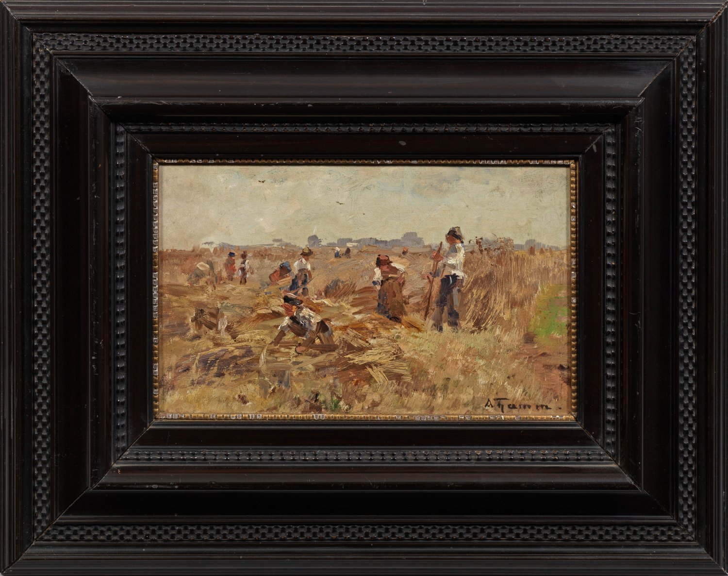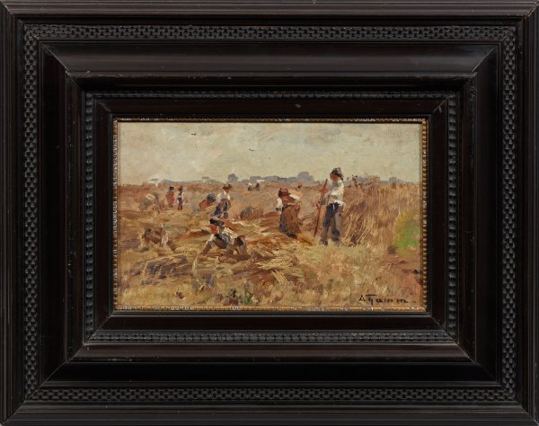Bauernfamilien bei der Getreideernte. Thamm, der bei Theodor Hagen in Weimar studierte und ab 1895 an der Akademie in Dresden lehrte, zeigte ein vergleichbares Motiv auf der Großen Berliner Kunstausstellung 1899. Öl/Malkarton. R. u. sign.; Verso Widmung "Herrn W. Franke gewidmet von A. Thamm 1921". 15,8 cm x 25,5 cm. Rahmen.