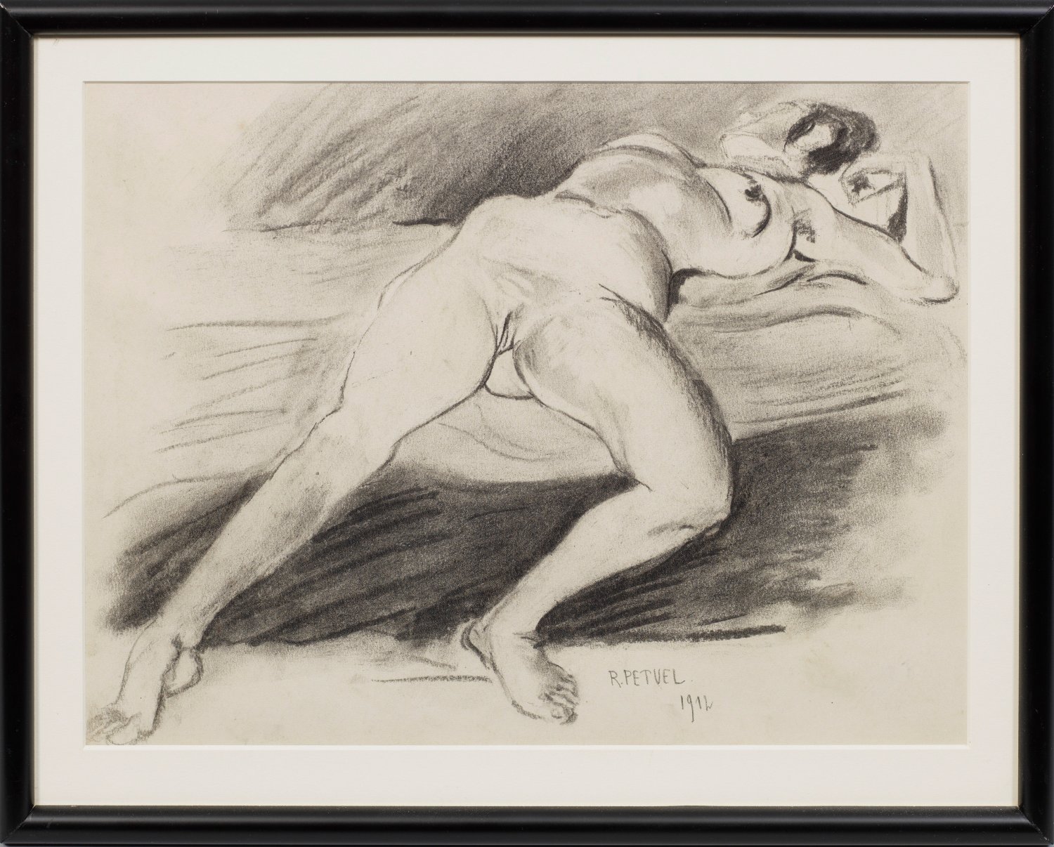 Impressionistisches Blatt Petuels, dessen Werke sich u. a. in der Bayerischen Staatsgalerie, der Pinakothek und Städt. Galerie in München befinden. Kohle/Papier. R. u. sign. u. dat. 1912. 30,5 cm x 41 cm (Passepartoutausschnitt). Rahmen.