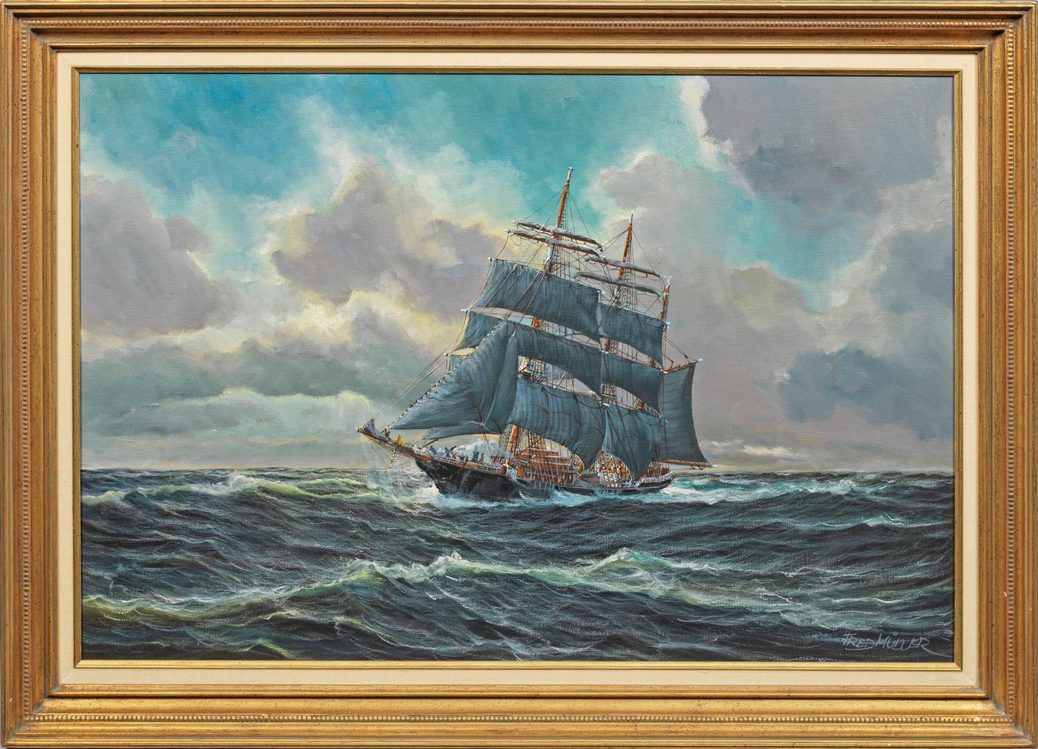 Minutiös gemaltes Schiffsporträt eines der bekanntesten neuzeitlichen Marinemalers. Müller fuhr selbst 20 Jahre zur See, bevor er sich der Malerei widmete. Öl/Lwd.; R. u. sign.; Verso betitelt. 60,5 cm x 89,5 cm. Rahmen.