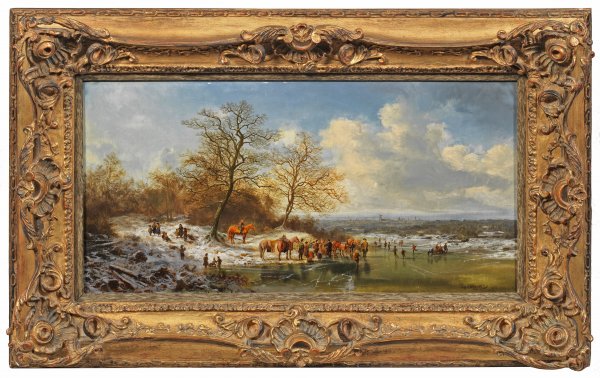 Blick auf eine durch reiche vielfigurige Staffage belebte, atmosphärisch gestimmte, feinmalerisch ausgeführte Winterlandschaft des bekannten Künstlers, der in seinen Werken mit Vorliebe die landschaftlichen Reize Oberbayerns schilderte. Öl/Holztafel. R. u. sign.; 25 cm x 50 cm. Rahmen.