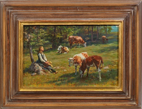 In der impressionistischen Erfassung des Lichts und der lebendigen Darstellung virtuos gemaltes Werk Budicins, der ab 1975 vielfach ausstellte und sich besonders der Tiermalerei widmet. Öl/Holztafel. R. u. sign.; 30 cm x 44 cm. Rahmen.