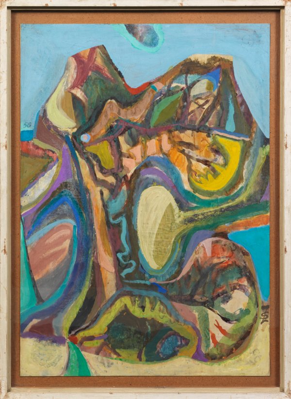 Expressionistisch-abstraktes Werk des Künstlers, der nach Kriegsteilnahme Ende der 1940er Jahre an der Berliner Kunstakademie studierte und 1951 den Berliner Kunstpreis erhielt. Als Mitglied des Deutschen Künstlerbundes und Träger des Marzotto-Preises war er bis in die 1970er Jahre regelmäßig auf Ausstellungen u. a. in Düsseldorf, München und Essen vertreten. Mischtechnik/leichter Karton. R. u. monogr.; Ausstellungsetikett verso. 100 cm x 70 cm. Originaler Künstlerrahmen.