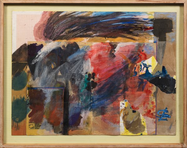 Informelles Werk unter Verwendung von Zeitungsausschnitten des Künstlers, der nach Kriegsteilnahme Ende der 1940er Jahre an der Berliner Kunstakademie studierte und 1951 den Berliner Kunstpreis erhielt. Als Mitglied des Deutschen Künstlerbundes war er bis in die 1970er Jahre regelmäßig auf dessen Ausstellungen, u. a. in Düsseldorf, München und Essen vertreten. Mischtechnik und Collage/leichter Karton. R. u. monogr.; Ausstellungsetikett verso. 75 cm x 99 cm. Originaler Künstlerrahmen.