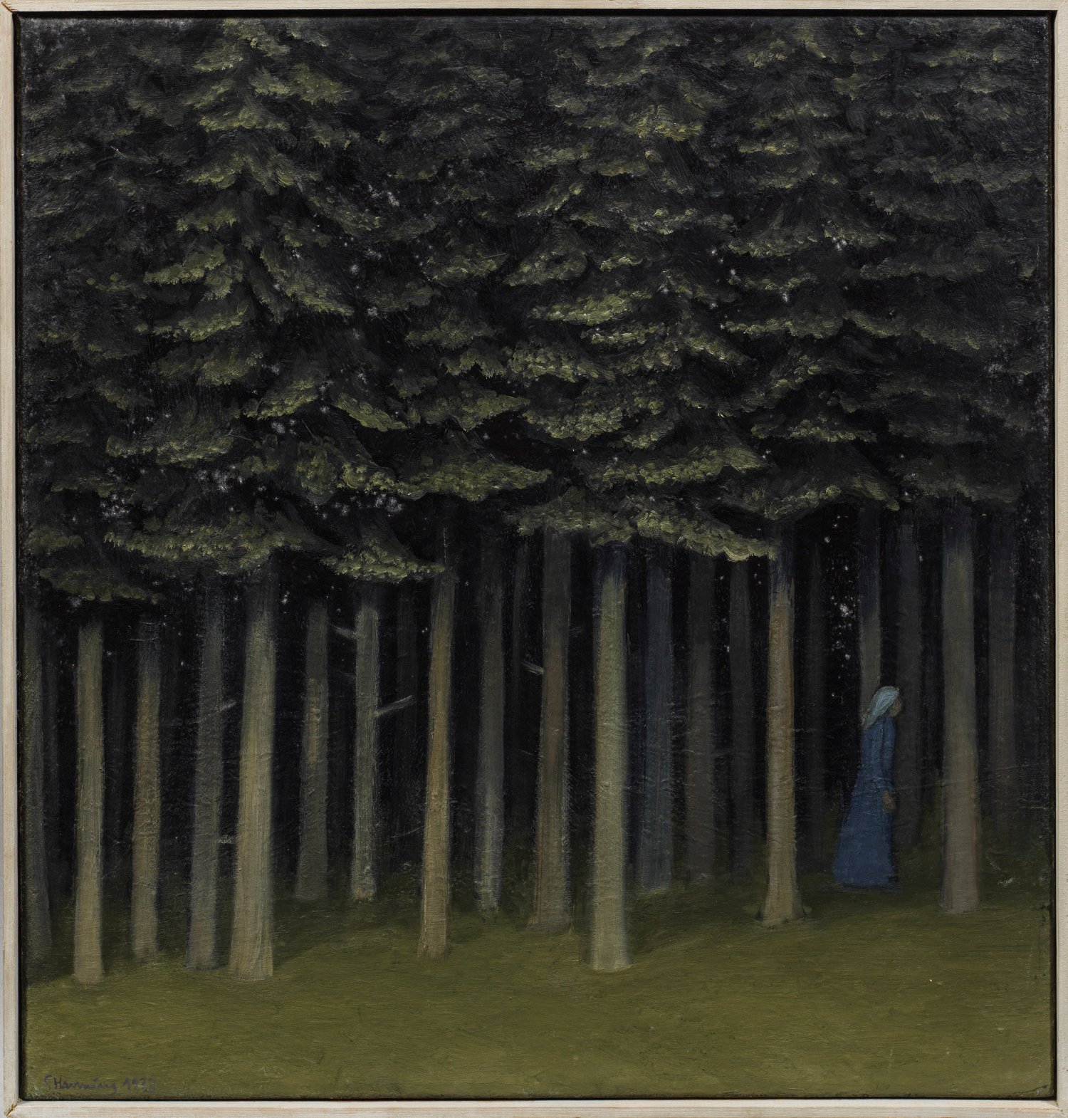 Durch einen dichten dunklen Tannenwald wandelnde Frau in blauem Kleid. Die Bremer Künstlerin Henning hatte bei Willy Baumeister in Stuttgart studiert und in ihrer Wahlheimat Bremen zahlreiche Ausstellungen bestritten, zuletzt unter dem Titel "Vom Geheimnis hinter den Dingen". Öl/Lwd.; L.u. sign. und dat. 1973; 45 cm x 43 cm.