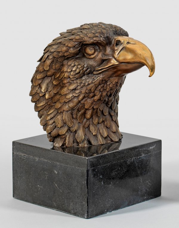 Bronze, braun und grün patiniert, teilw. poliert. Sign. "Milo". Dunkelgrauer Steinsockel. Vollplastische, naturnahe Darstellung mit detailreicher Wiedergabe des Gefieders. Ges,-H. 30 cm.