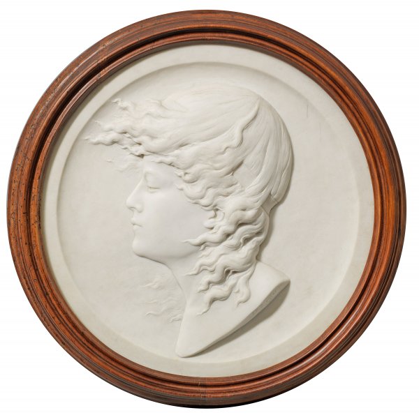 Weißer Carrara-Marmor. Sign. u. dat. 1890. Frühes Hauptwerk Zieglers mit meisterhaft fein und subtil gearbeiteten, vom Wind bewegten Haarsträhnen, die den traumverlorenen Ausdruck des Mädchens verstärken. Der vielseitige Bildhauer, über dessen Biographie nur sehr wenig bekannt ist, kam 1892 in die USA, wo er bei Karl Bitter lernte. Seit Anfang des 20. Jhs. schuf er zahlreiche Modelle für die Gorham-Gießerei in Providence/Rhode Island. Relief-D. 41 cm. Rahmen.