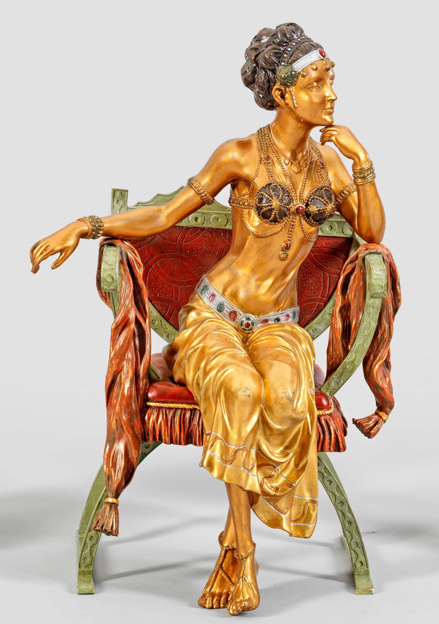 Bronze, polychrom bemalt. Gem.; In einem gepolsterten Armlehnstuhl sitzende junge Frau in sinnierender Pose. Große, vollplastische Figur in der Tradition der Wiener Bronzen. Bemalung partiell ber.; H. 46 cm.
