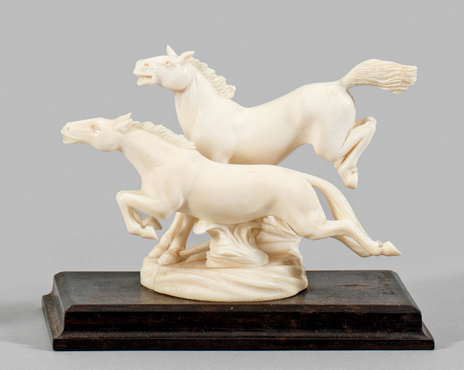 Elfenbein geschnitzt; Am Ebenholzsockel sign. u. dat. 1925. Frühes Werk Walthers mit lebendiger Wiedergabe der springenden bzw. galoppierenden Pferde in ihrer schnellen Bewegung. Ein Schwanzansatz minim. rest.; Ges.-.H. 8,8 cm.; B. 11,7 cm.