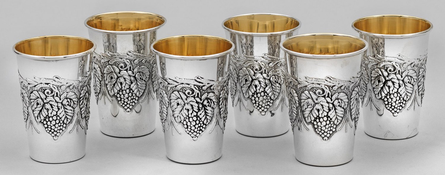 Sechs Becher Silber. Konischer Korpus mit gerundetem Rand. Wandungsmitte reliefplastisch gestaltet in Form von Weinreben. Innen vergoldet. Gest. 925. Teilw. best.; Gew. zus. ca. 310 g. H. 8,5 cm.