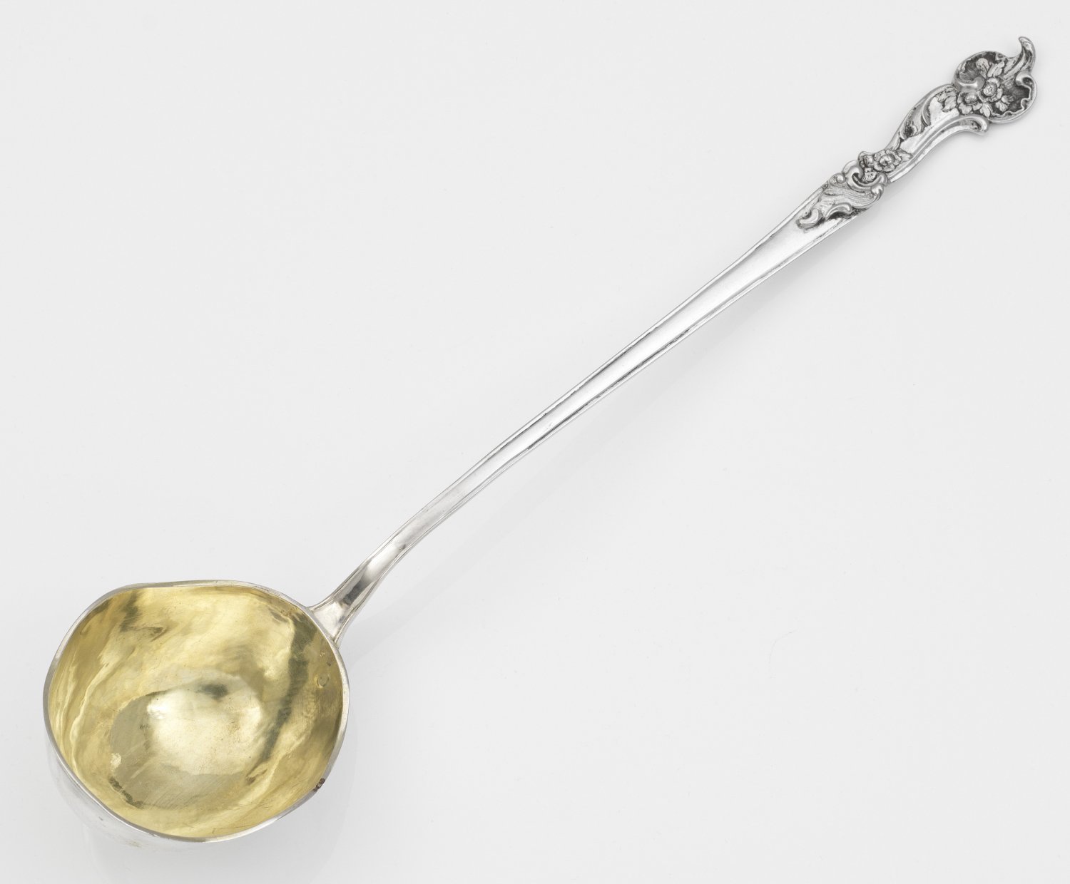 Großer Rokoko-Wasserschöpfer Silber. Tief gemuldete vergoldete Laffe, in dreifach ausschwingender Form. Der lange reliefierte Stiel in geschwungenen, reliefplastischen Rocaillen und Blüten endend. Gest. Stadtmarke, Meister Christian II Drentwett (wird Meister 1754). Gew. ca. 310 g. L. 47 cm.