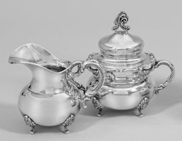 Zuckerdose und Milchgießer im Barockstil Silber. Über drei Füßen bauchiger Korpus mit glatter Wandung und Rocailledekor. Minim. best.; Gest. Sterling, Herstellerzeichen. Gew. ca. 592 g. H. 16,5 cm.