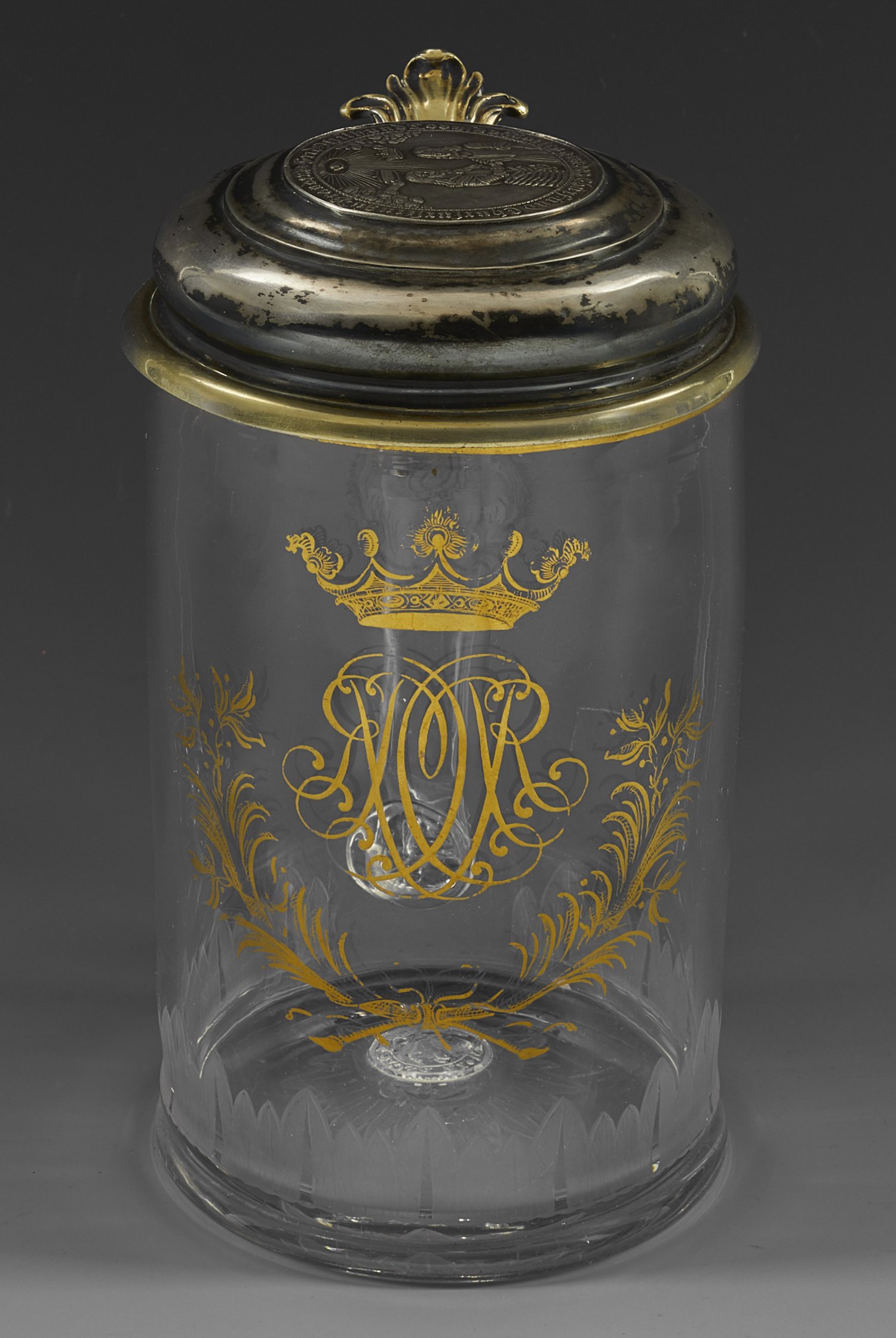 Farbloses Glas. Im Boden eingeglaste Silbermünze (IIII Mariengroschen, Kurfürstentum Braunschweig-Calenberg-Hannover bzw. Braunschweig-Lüneburg, 1700) und matt geschnittene Sonnenblumenrosette. Über dem Stand geschnittene Blattbordüre, auf der Wandung Spiegelmonogr. mit Krone und Lorbeerzweigen in Goldmalerei, vergoldeter Lippenrand. Teilvergoldeter, profilierter, gewölbter Silberdeckel mit Akanthusblattdrücker. Die Medaille schauseitig mit szenischer Darstellung der Vermählung des 1640-1688 regierenden Großen Kurfürsten Friedrich Wilhelm von Brandenburg am 27.11.1646, rücks. mit allegorischer Darstellung der Mark Brandenburg und stilisierter Stadtansicht von Berlin. H. 20,5 cm.