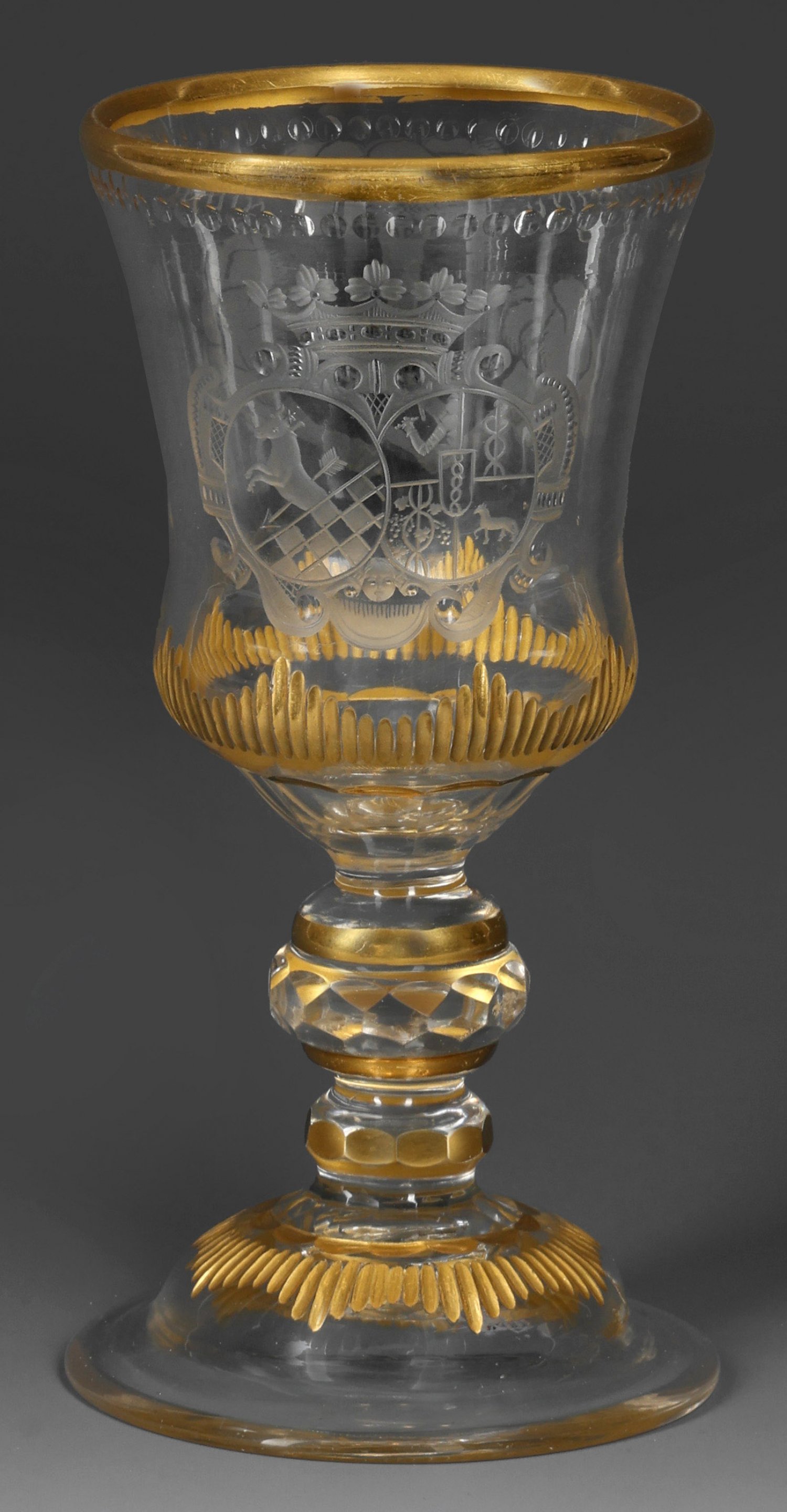 Uradelsgeschlkechts Farbloses Glas mit Schliff- und Schnittdekor. Glockenförmiger, gewölbter Fuß mit vergoldeter, schraffierter Sternrosette, massiver Balusterschaft mit facettiertem Kugelnodus, die glockenförmige Kuppa mit geschältem Ansatz und korrespondierend schraffierter Bordüre. Auf der Kuppa geschnittener, teilw. geblänkter Dekor. Auf der einen Seite Darstellung zweier, sich die Hand reichender Arme und einem darüber beschützenden Arm sowie die Devise "A la parfaite amitiée" (Auf die perfekte Freundschaft). Gegenüber ein Allianzwappen mit Adelskrone, darunter das Wappen des pommerschen Uradelsgeschlechts von Bandemer und der Grafenfamilie von Schlippenbach. Lippenrand mit geblänkten Perlen. H. 18,5 cm.