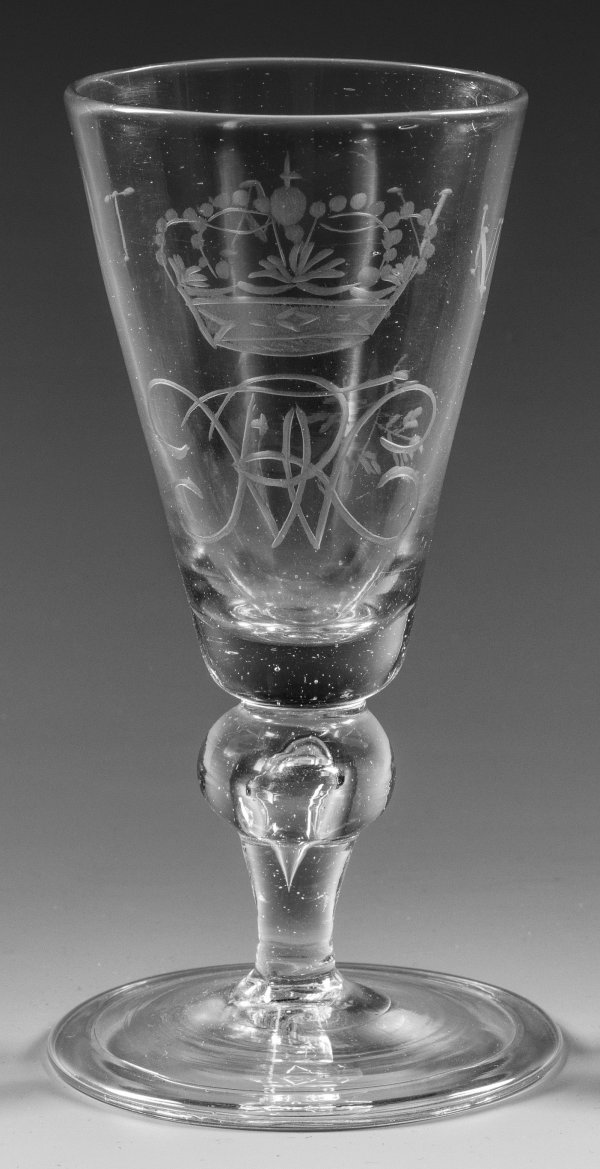 Pokal mit Monogramm König Friedrich Wilhelm I. von Preußen Farbloses Glas. Flacher Scheibenfuß mit umgeschlagenem Rand, Balusterschaft mit eingestochener Luftblase, konische Kuppa. Matt geschnittener Dekor mit Inschrift und Ligatur-Monogr. "VIVAT FWR" (=Fridericus Wilhelmus Rex) unter der preußischen Königskrone für König Friedrich Wilhelm I. von Preußen. H. 17,3 cm.