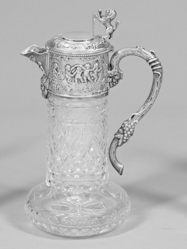 Karaffe mit Silbermontierung. Gedrückter Korpus aus farblosem Glas mit facettiertem Dekor. Reliefplastische Montierung mit flächendeckendem Dekor aus spielenden Putti und Maskaron. Bekrönende Daumenrast mit stehendem Löwen. Gest. 925, Herstellerzeichen. H. 30,5 cm.