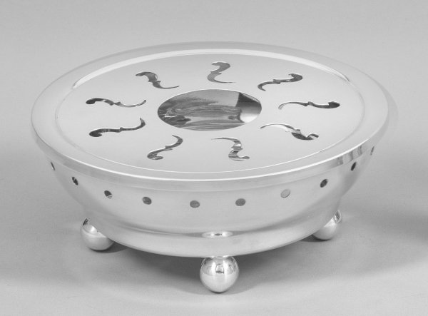 Stövchen Silber. Von Kugelfüßen getragener Korpus mit abnehmbarer, ornamental durchbrochen gearbeiteter Deckplatte. Gest. 925. Gew. ca. 385 g. D. 15 cm.