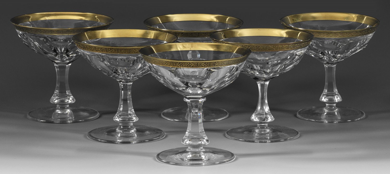 A set of six Moser "Lady Hamilton" martini glasses with acid-etched and gilt rims. One glass with acid factory mark.