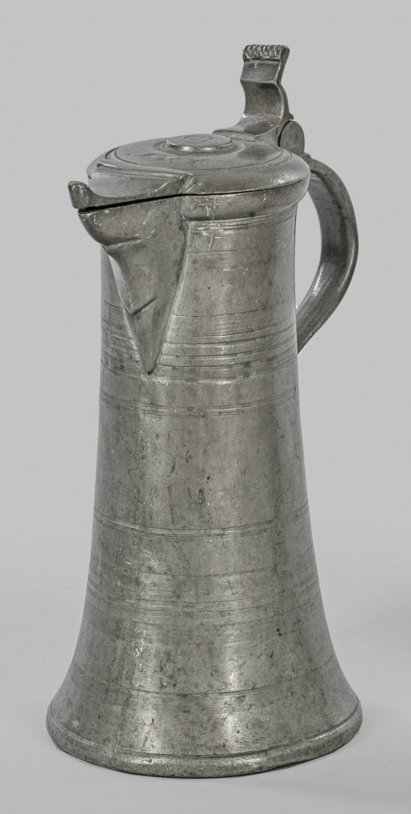 Salzburger Stitze Über ausgestelltem Stand konischer Korpus mit Schnabelausguss. Flacher, leicht profilierter Deckel mit Monogramm C.L. und Inschrift. Ausgussabdeckung und geschwungene Daumenrast. Gem., Stadtmarke, Meister Wolf Hentz d. Ä. (tätig seit 1600). H. 30 cm.