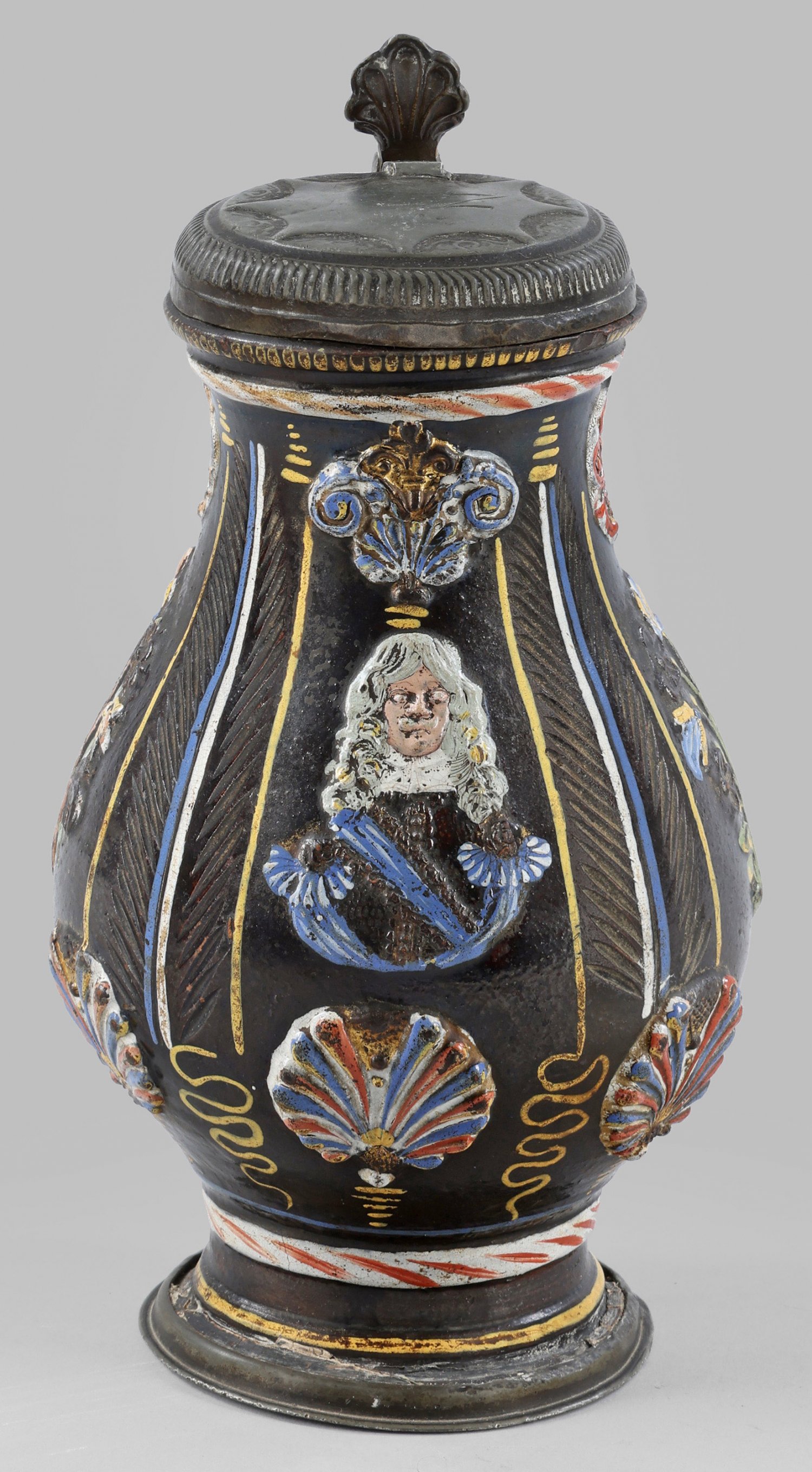 Birnkrug Sog. "Annaberger Krug". Hochgebrannte Irdenware (oder Steinzeug), dunkelbraunschwarz engobiert und salzglasiert. Aufgelegter und mit polychromen Emailfarben bemalter Dekor aus einem Fürstenbildnis, Blütenstängeln und Palmetten- bzw. Rankenmotiven mit Trauben; vertikale Gliederung durch fiederblattartige, vertikale Bänder in Kerbschnitt. Zinngefasster Stand und Zinndeckel mit Muscheldrücker. H. 24 cm.
