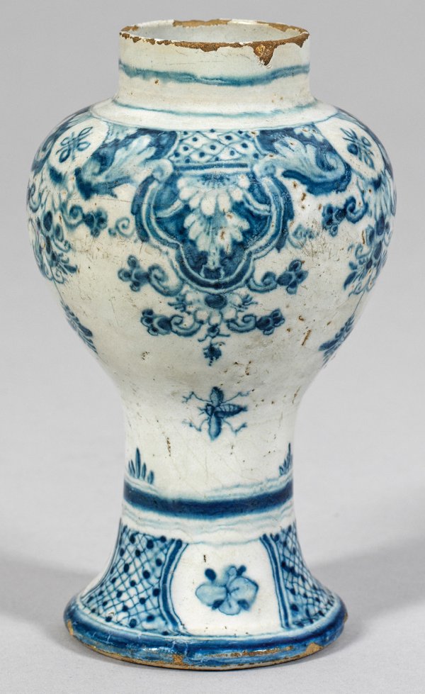 Kleine Braunschweiger Vase Balusterform mit hohem, ausschwingendem Fuß, ovoidem Korpus und kurzem Zylinderhals. Scharffeuerbemalung in abgestuften Blautönen aus einem Behangdekor, floralen Motiven, Rankenwerk und Netzmuster. Ger. best.; Manufaktumarke "VH" in Ligatur mit Maler-Monogr.; H. 13,8 cm.
