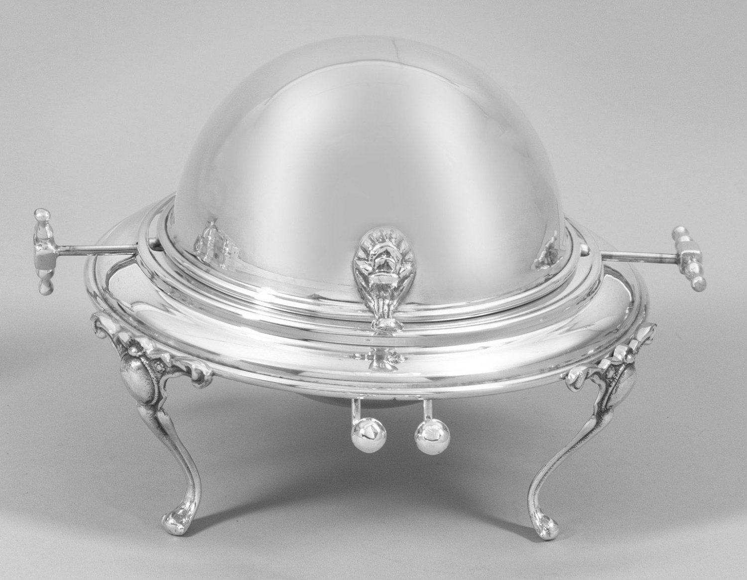 Kaviarschale Silber. Halbrunder Korpus auf drei hohen, gebogten Beinen. Klappdeckel mit seitlichen Griffen. Frontseitig Löffelablage. Glaseinsatz. Gest. 925. Minim. Gebrauchsspuren. Gew. ca. 600 g. H. 14 cm.