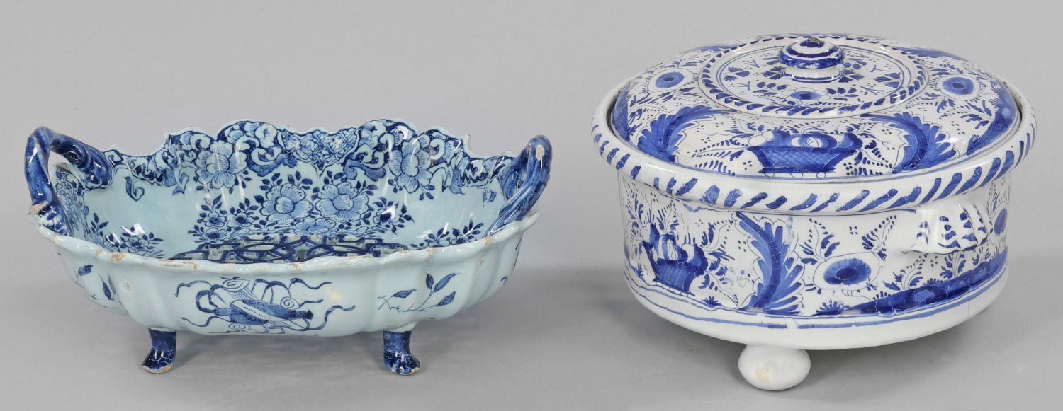 A Nuremberg blue and white faience tureen and a Dutch Delft basket. Minor hairline cracks and restorations to the tureen, minor chips to the basket. Factory mark or painter's number.