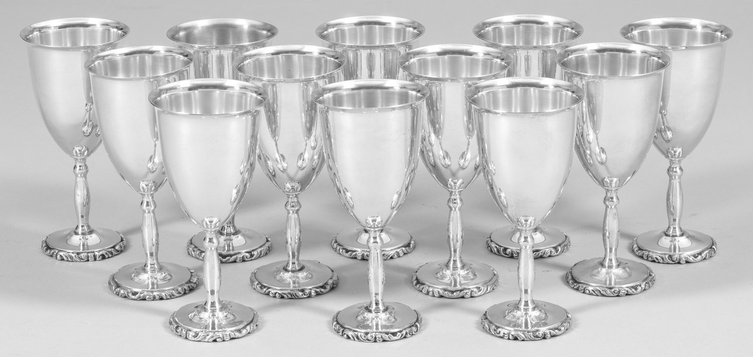 Zwölf Weißweinbecher Silber. Glatte Pokalform mit reliefplastischem Blattrand am Fuß. Minim. Gebrauchsspuren. Gest. 925. Gew. zus. ca. 2100 g. H. 14 cm.