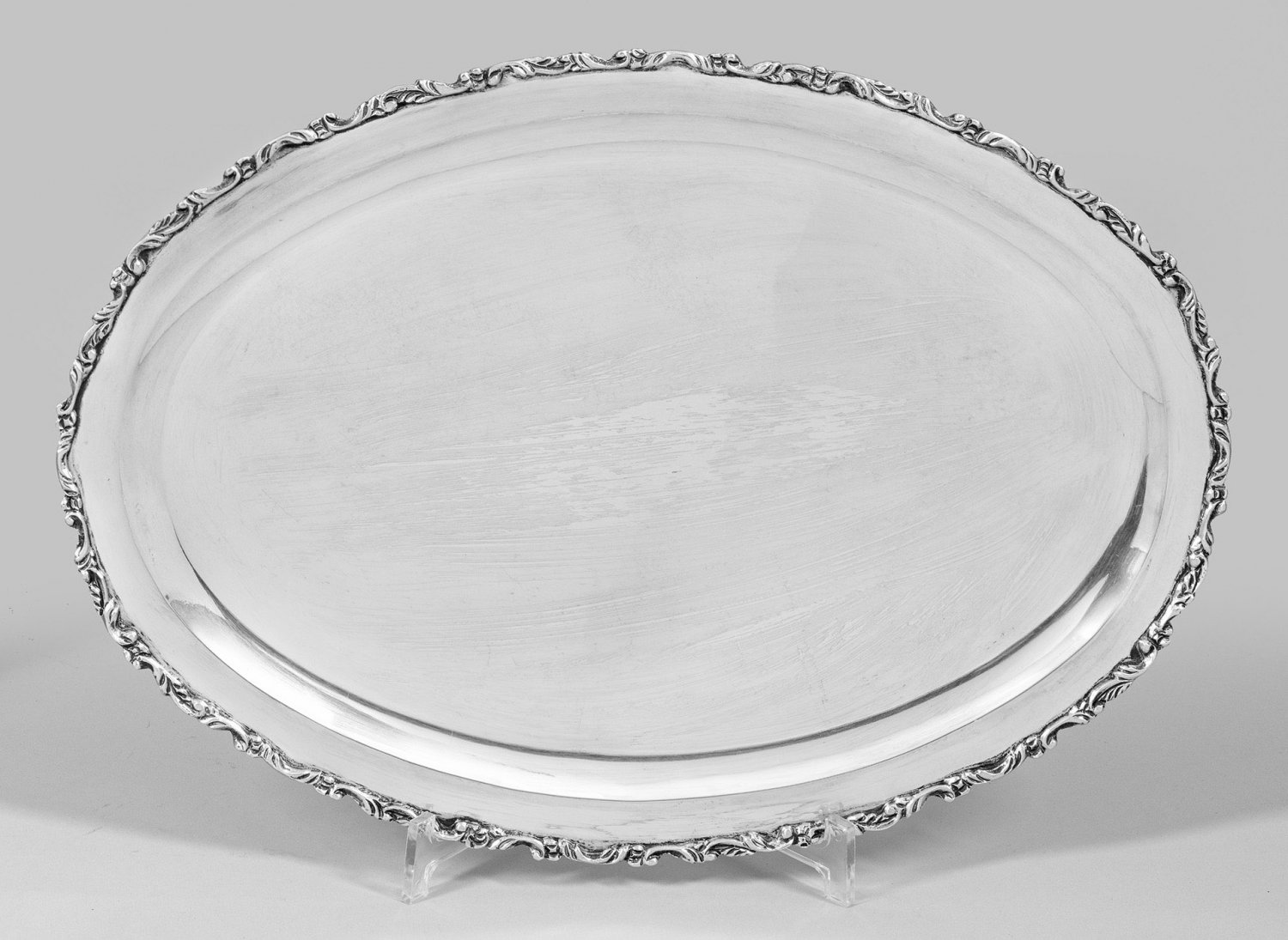 Tablett Silber. Ovale, glatte Form mit reliefplastischem Blattrand. Minim. Gebrauchsspuren. Gest. 925. Gew. ca. 700 g. B. 40 cm.