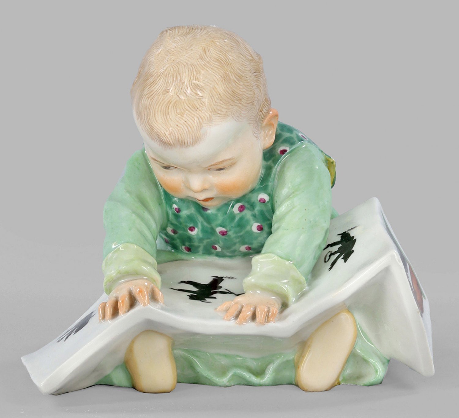 Kind mit Bilderbuch sog. Hentschelkind. Auf dem Boden sitzendes Kind in grüner, teilw. gemusterter Kleidung, vor sich ein auf seinen Beinen aufgeschlagenes Bilderbuch mit Szenen aus dem "Struwwelpeter" betrachtend. Polychrome Aufglasurmalerei. Entw. Konrad Hentschel, 1904. Modell-Nr. U 149. Schwertermarke. H. 10 cm.