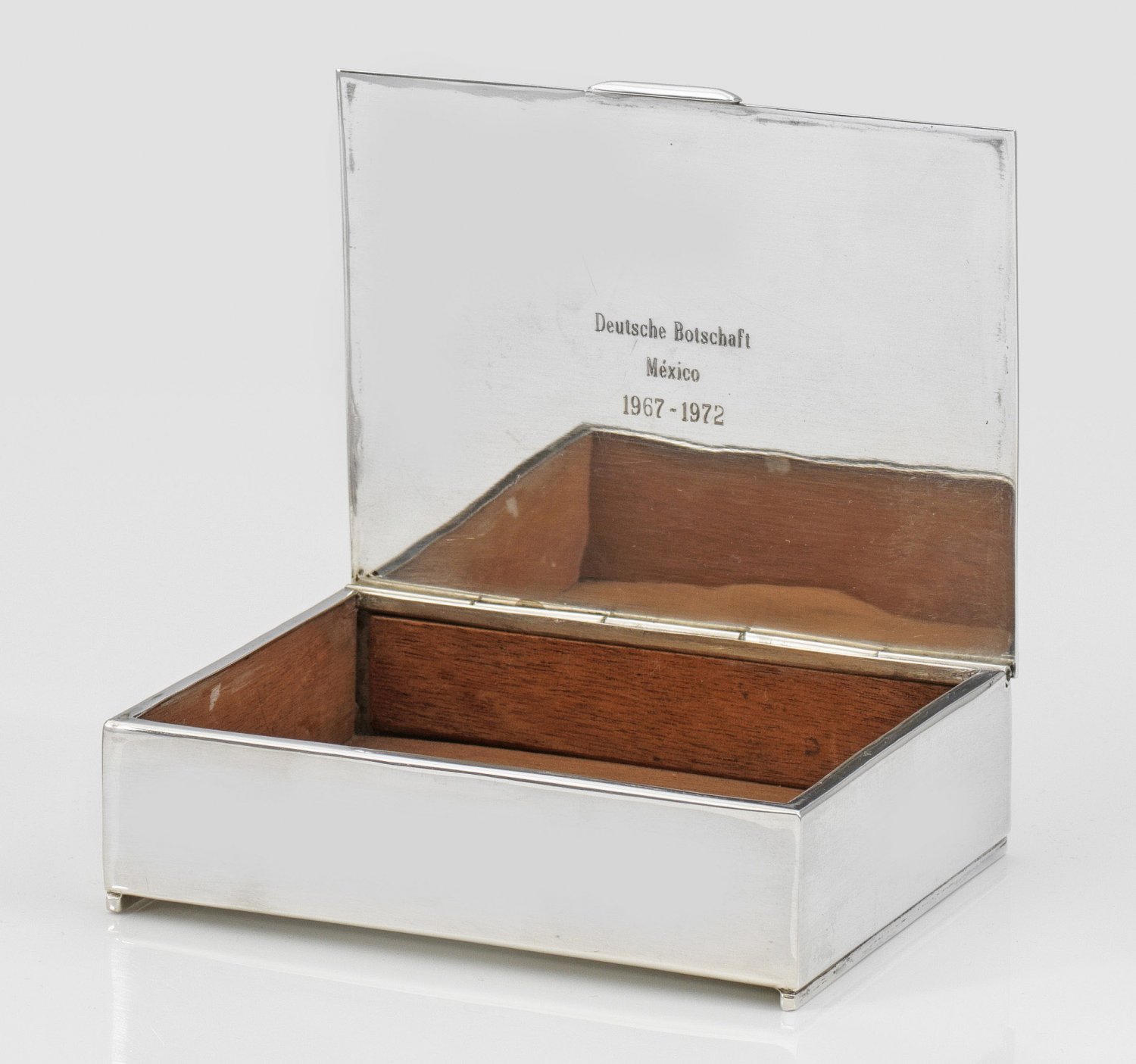Zigarettenkiste Silber. Schlichte, glatte Kastenform. Auf der Deckelinnenseite graviert: "Deutsche Botschaft Mexico 1967-1972". Mit Balsaholz ausgekleidet. Gest. 925. Gew. ca. 645 g. H. 10 cm.