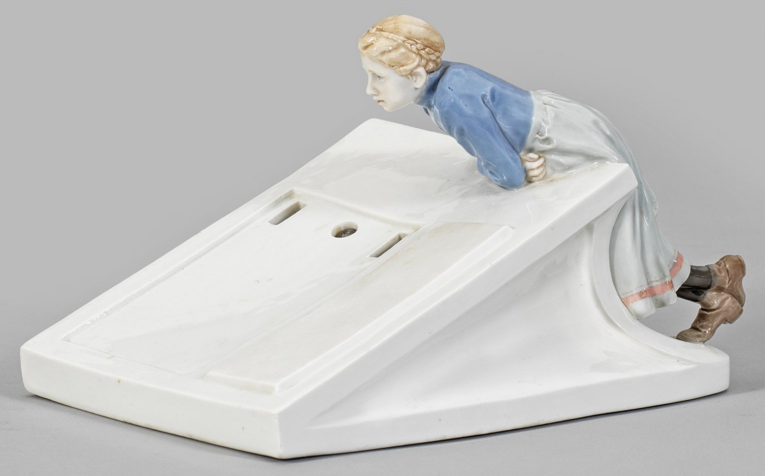 Notizblockhalter mit Mädchen sog. Hentschelkind. Aus einer vierteiligen Schreibtischgarnitur. Über rechteckigem, geschweift ansteigendem Stand pultartig abgeschrägte Fläche mit Montierungslöchern für Notizblock. Rückseitig, sich an der Hinterkante aufstützendes, vorgebeugtes Mädchen mit verschränkten Füßen. Polychrome Malerei. Entw. Konrad Hentschel, um 1904. Modell-Nr. U 141. Schwertermarke. H. 12,5 cm. 22 cm x 16 cm.