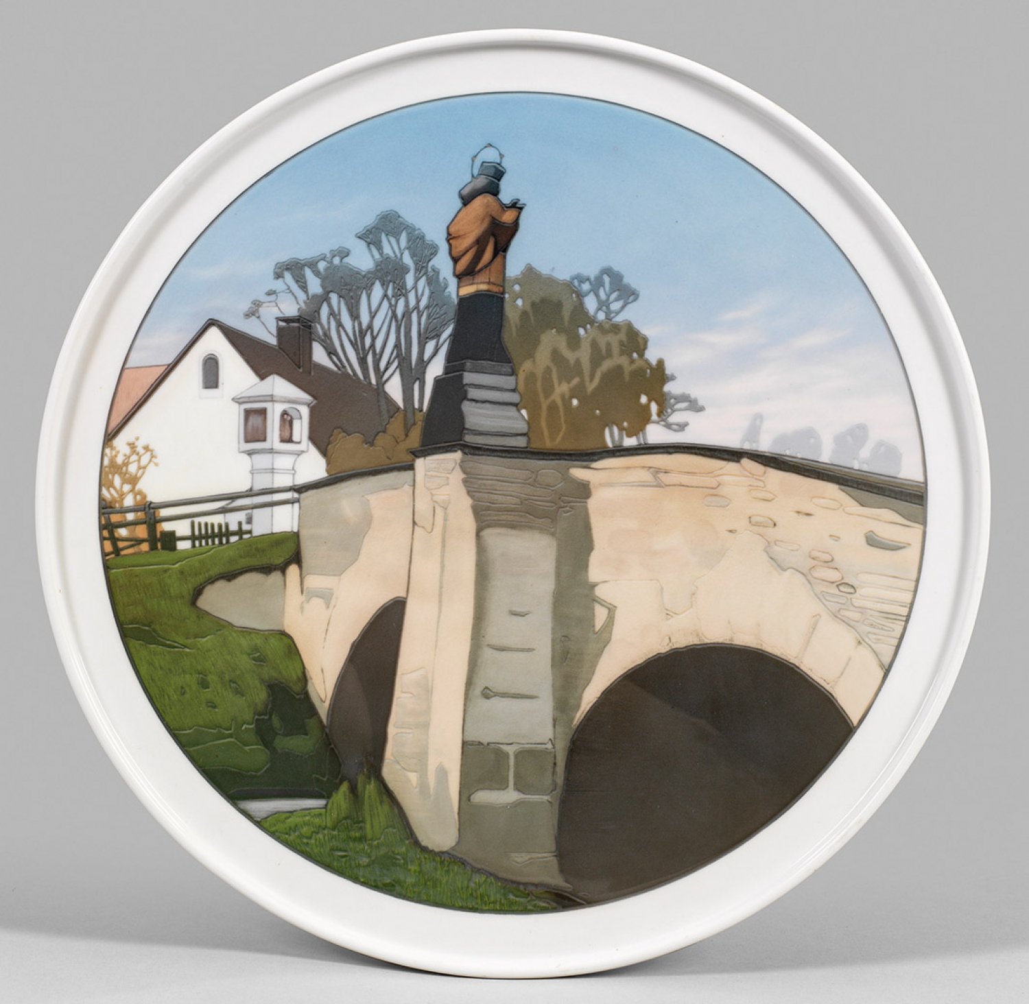 Wandteller mit St. Nepomukbrücke Rundes, flaches Plateau mit profiliertem Rand. Im Spiegel medaillongerahmte Ansicht der St. Nepomukbrücke mit Heiligenfigur vor der Klostermühle in Grüssau (heute Krzeszów)/Schlesien. Dekor-Entw. Franz Türcke. Polychrome Unterglasurmalerei. Jahresbuchstabe. Zeptermarke. D. 41 cm.