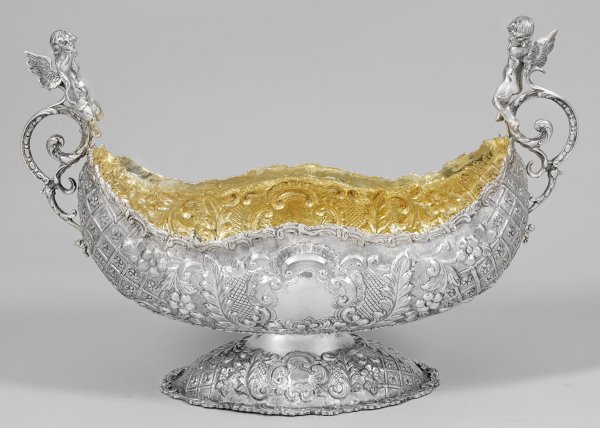 Prunk-Champagnerkühler Silber. Auf ovalem, ansteigendem Postament Korpus in Form einer venezianischen Gondel mit zwei vollplastischen, Flöte spielenden Amoretten an den beidseitigen, geschwungenen Handhaben. Wandung mit reliefierten und punktierten Rocaillen-, Blüten- und Gitterdekorationen überzogen. Innen vergoldet. Gest. 800, Herstellerzeichen. Gew. ca. 2700 g. H. 35 cm. 52 cm x 24 cm.