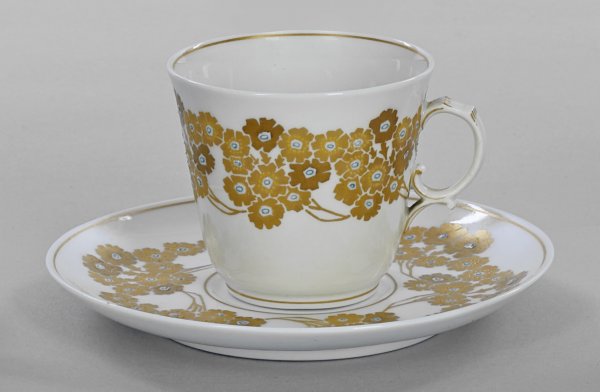 Jugendstil-Mokkatasse mit Untertasse. Auf der Wandung und im Spiegel umlaufender Golddekor aus üppigen Blütenzweigen mit gelben und blau-weißen, aufgeschmolzenen Emailperlen. Minim. rest.; Zepter- und Malereimarke. H. 5,5 cm.