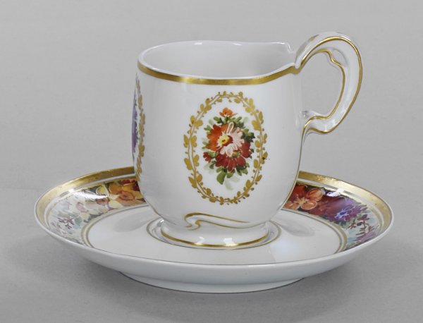 Jugendstil-Mokkatasse mit Untertasse. Becherform mit bandartig geschwungenem Henkel, am Stand in umlaufenden Reliefdekor übergehend. Auf der Wandung goldornamentierte Ovalmedaillons mit farbenprächtigen Blumenbuketts, im Spiegel breite Blütenbordüre. Polychrome Malerei mit reicher Goldstaffage. Zeptermarke. H. 5 cm.