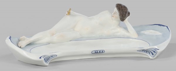 Jugendstil-Schreibschale mit Mädchenfigur Längliche, geschweifte Federschale mit nierenförmiger und rechteckiger Vertiefung für Schreibfedern bzw. Tintenfass, umzogen von feinem, fächerartigem Jugendstildekor. Oberhalb vollplastische Darstellung eines liegenden, weiblichen Aktes, sich im Spiegel betrachtend. Sparsame Aufglasurmalerei mit dezentem Golddekor. Entw. Arthur Lange (1875 - 1929), 1903. Modell-Nr. T 180. Minim. rest.; Manufakturmarke. H. 9,5 cm. 36 cm x 16 cm.