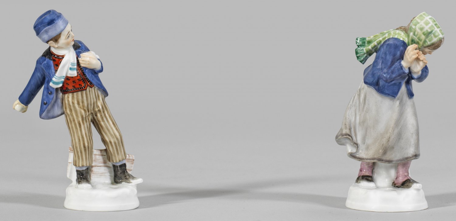 Zwei Kinder bei der Schneeballschlacht Auf Schneeterrain-Sockel zwei Kinder stehend, der Junge einen Schneeball nach dem Mädchen werfend, den dieses versucht abzuwehren. Polychrome Malerei. Entw. Alfred König. Modell-Nr. W 131, W 132. Minim. rest.; Schwertermarke. H. 22,5 cm.