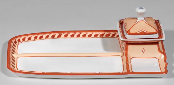 Seltenes Jugendstil-Schreibzeug Rechteckig, quadratisches Tintenfass mit doppeltem Einsatz, gewölbter Deckel mit petschaftartigem Knauf. Modell-Nr. T 188. Stilisierter Blattrankendekor in Korallenrot und Hellockerrot. Entw. Wilhelm Thiele, um 1907. Modell-Nr. T 188. Äußerst minim. best.; Schwertermarke. 31,5 cm x 17,5 cm.