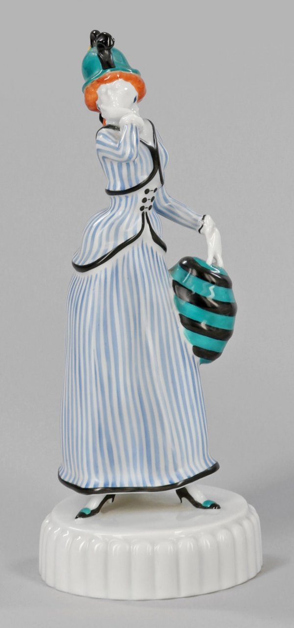 Dame mit Muff Über gerippten, reliefiertem Rundsockel stehende mondäne Dame mit extravagantem Hut, in der linken Hand einen Muff haltend. Polychrome Aufglasurmalerei mit schwarzen Konturierungen. Entw. Ludwig Vierthaler, 1914/1915. Entw.-Monogr. in Ligatur; Manufakturmarke. H. 22 cm.