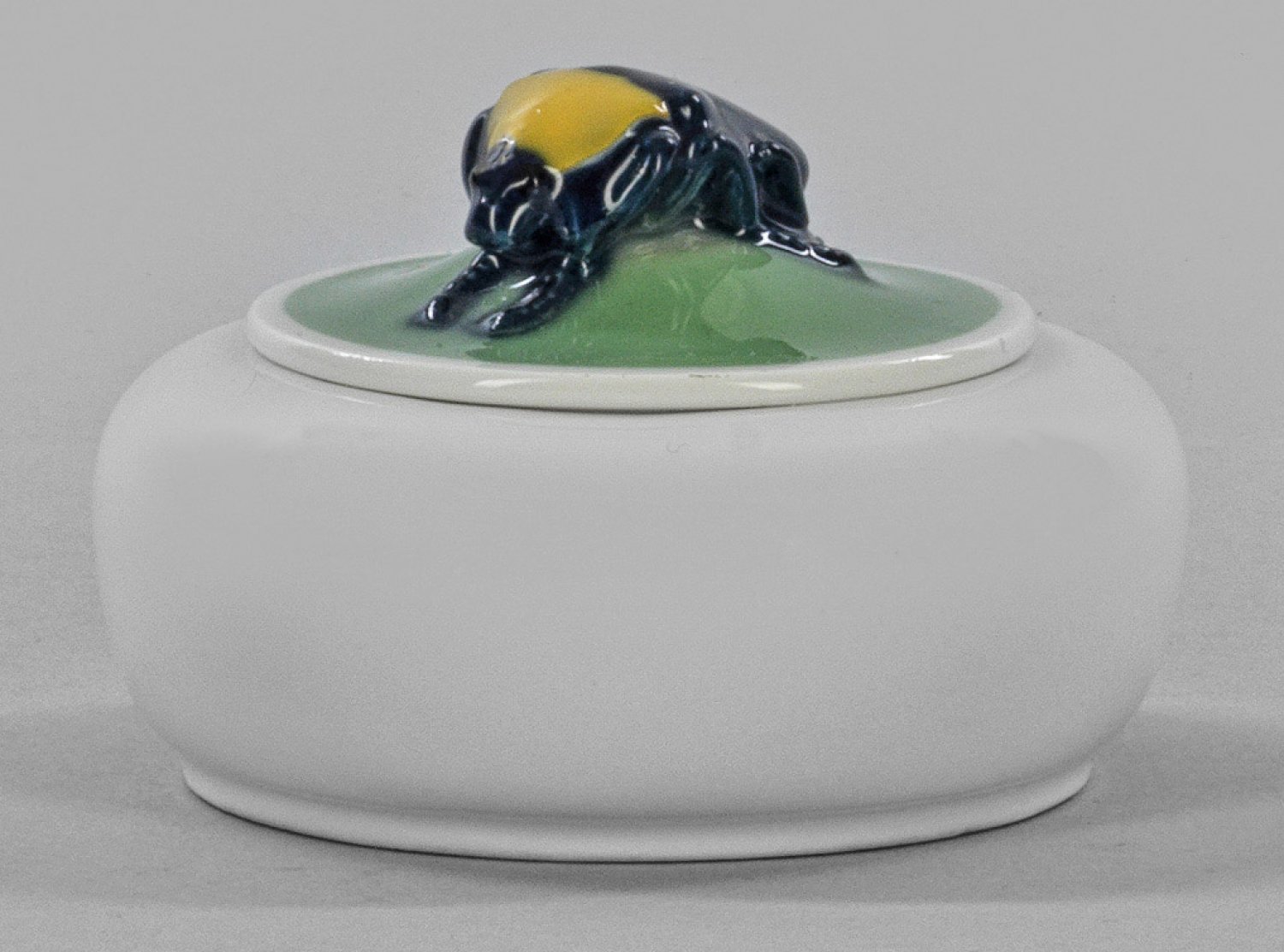 Jugendstil-Deckeldose mit Käferknauf Über abgesetztem Stand runder, gedrückt bauchiger Korpus. Auf flach gewölbtem Deckel plastischer Knauf in Gestalt eines Käfers in polychromer Unterglasurmalerei in Grün, Blau und Gelb. Entw. Max Esser, 1914. Zepter-, blaue Malerei- und Gedächtnismarke. H. 5,5 cm. d. 8,5 cm.