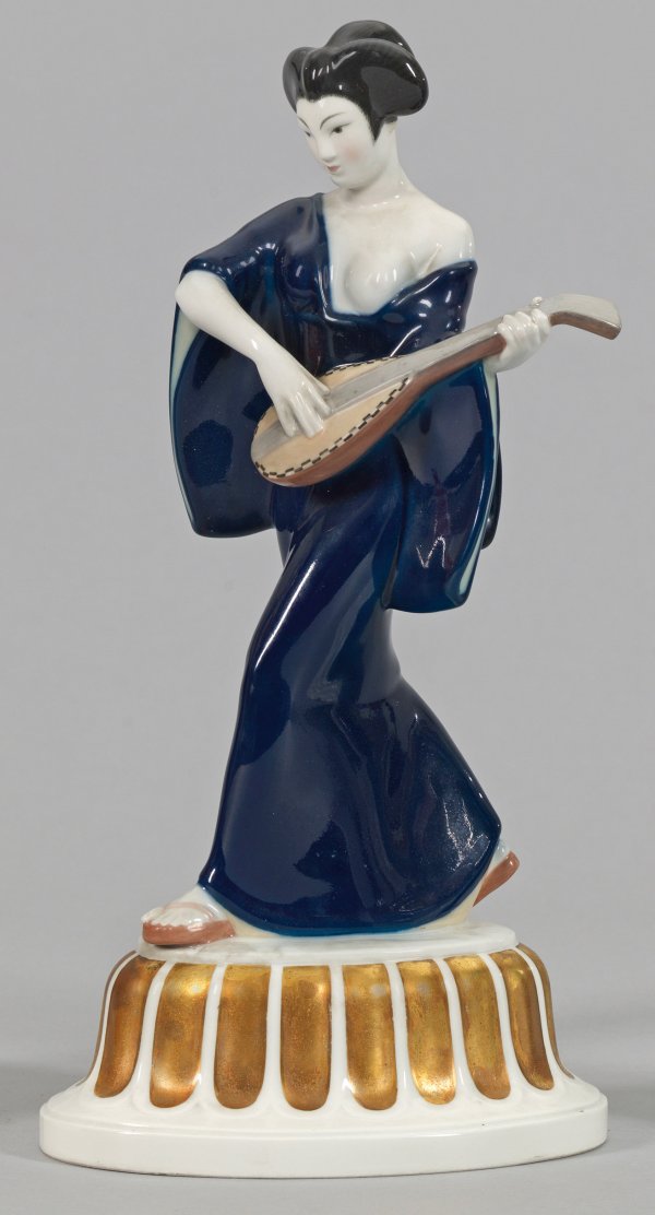 "Japanerin". Originaltitel Figur aus dem "Hochzeitszug". Schreitende Japanerin mit Mandoline auf ovalem Sockel. Polychrome Unter- und Aufglasurmalerei mit Gold. Unw. rest.; Entw. Adolf Amberg 1909. Entw.-Bez.; Modell-Nr. 9221. Minim. rest.; Zepter- und Malereimarke (in Rot und Unterglasurblau). Jahresbuchstabe "T". H. 32 cm.