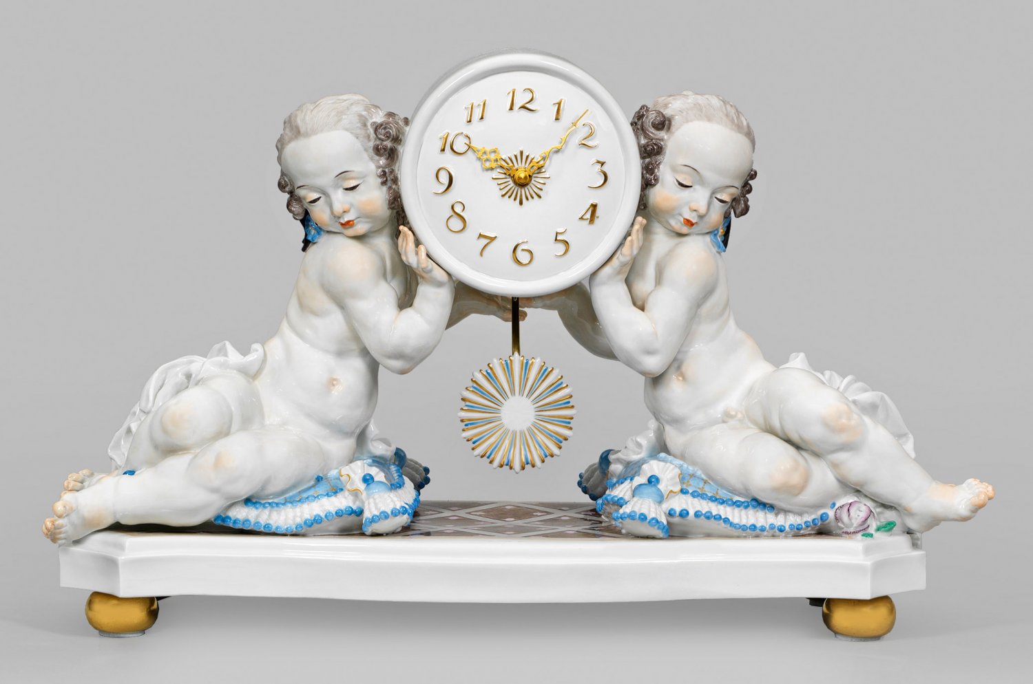 Große Kaminuhr "Uhr von zwei Putten getragen". Originaltitel Rechteckiger, geschweifter, an den Ecken abgeschrägter Sockel auf gedrückten Kugelfüßen. Darüber, jeweils auf Kissen zur Mitte gelehnt, ein sitzendes Puttenpaar, Mädchen und Knabe, das zylindrische Uhrengehäuse stützend. Polychrome Malerei mit Gold. Auf weißem Zifferblatt vergoldete, arabische Ziffern in erhabenem Relief. In Hellblau und Gold staffiertes Porzellanpendel in Gestalt einer strahlenden Sonne. Entw. Paul Scheurich, 1915-19. Modell-Nr. 60830. Minim. Glasurmakel. Jahreszeichen. Schwertermarke. H. 37 cm. 60 cm x 23 cm.