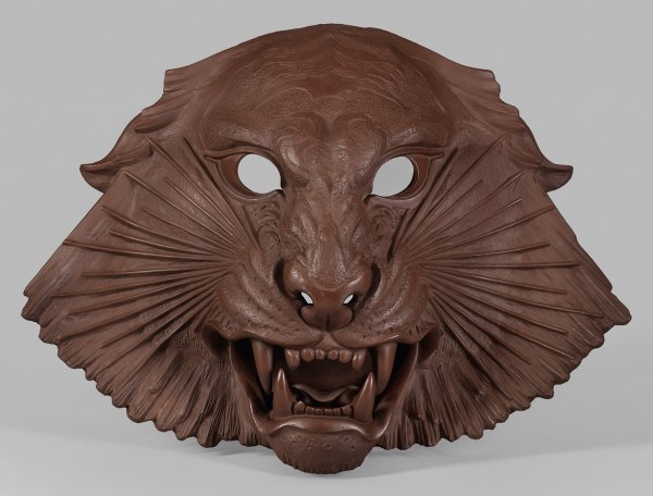 Große ausdrucksstarke Tigermaske Böttgersteinzeug, teilw. poliert an Augenpartie, Nase und Zähnen. Äußerst expressive, stilisierte Reliefmaske eines Tigers mit aufgerissenen Augen, die Zähne zeigend. Teilw. durchbrochen gearbeitet. Entw. Max Esser, um 1924 - 1935. Eingeritzte Künstler-Sign. mit Dat. "M. Esser 1924". Modell-Nr. A 1099. Limitierte Aufl., bez. "Aus 55 Ausformungen No. 7". Eingepresst "Böttgersteinzeug". Schwertermarke. H. 37 cm. 51 cm x ca. 16 cm.