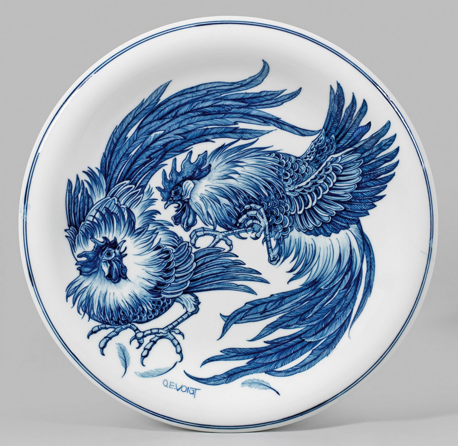 Großer Wandteller "Streithähne" Runde, flach gemuldete Form. Im Spiegel kämpfende Hähne mit aufgeplustertem Federkleid und langen Schwanzfedern. Naturalistische Darstellung mit ornamentalen Gestaltungselementen, an japanische Vorbilder anknüpfend. Unterglasurblaue Malerei. Entw. Otto Eduard Voigt (1870-1949). Künstler-Sign.; Rest.; Schwertermarke. D. 48 cm.