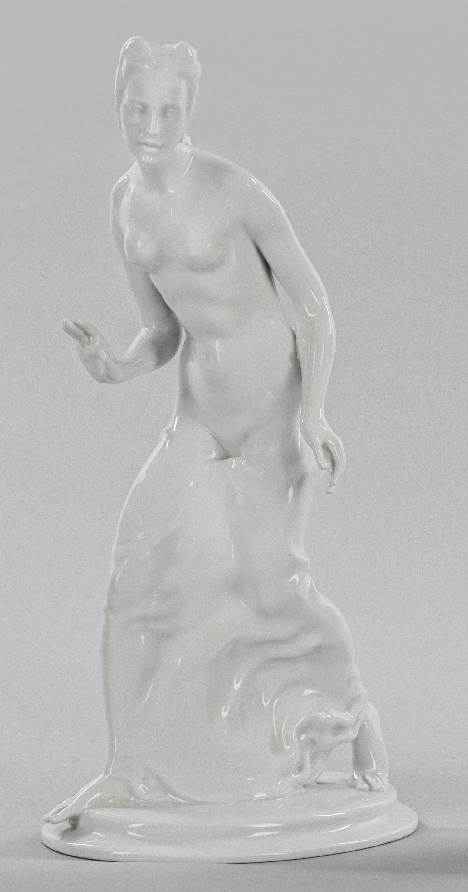 Aphrodite Weißporzellan. Mit einem Tuch bekleidete Göttin Aphrodite auf einem getreppten Ovalsockel. Entw. Hermann Hubatsch, 1921. Entw. Bez.; Jahreszeichen. Unw. rest.; Zeptermarke. H. 36 cm.