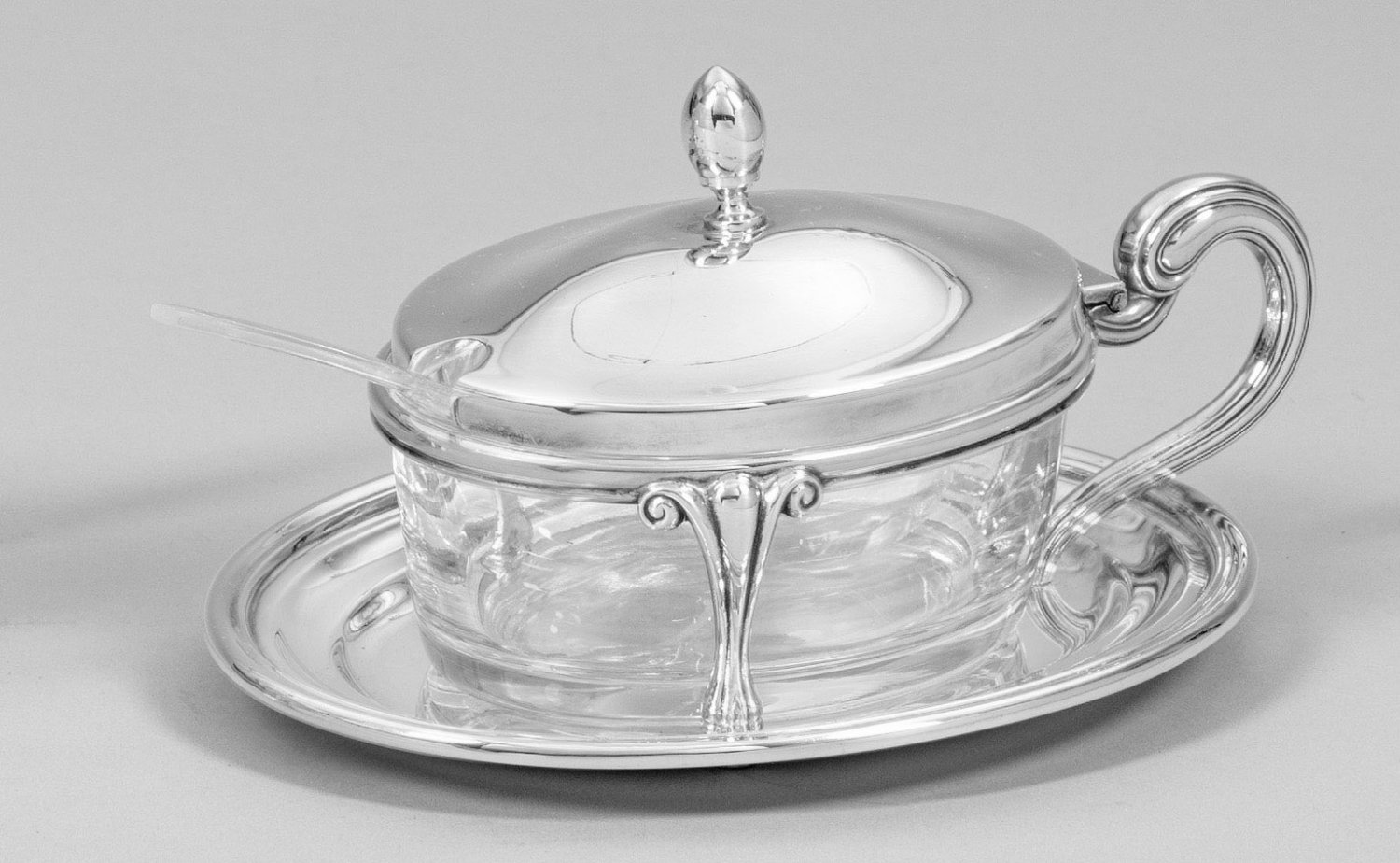Parmesandeckeldose Silber, Glas. 2-tlg. Auf ovalem Tablett montiertes, godroniertes Gestell mit scharniertem Deckel, bekrönt mit Zapfenknauf und Handhabe. Gest. Sterling, Herstellerzeichen. Gew. ca. 248 g. B. 22,5 cm.