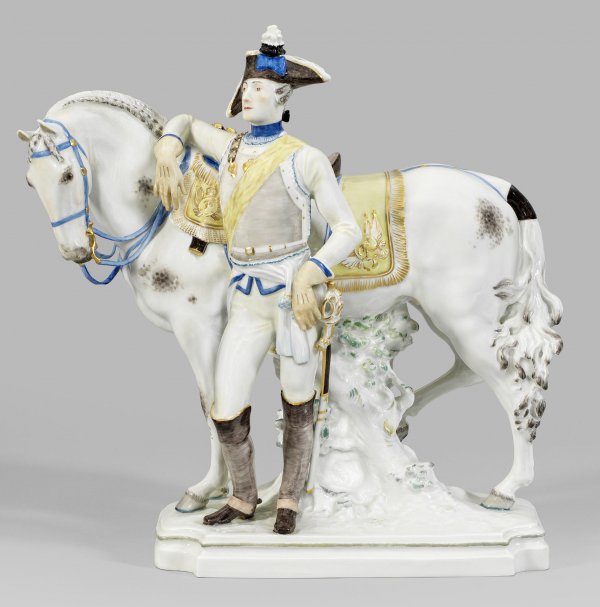 Profilierter, an den Ecken eingezogener Rechtecksockel. Neben seinem gesattelten Pferd in stolzer Pose stehender, uniformierter Friedrich Wilhelm von Seydlitz (1721 - 1773) im Alter von 37 Jahren, preußischer Kürassier und späterer Generalleutnant unter Friedrich dem Großen. Seinen rechten Arm auf den Sattelbock stützend und die linke Hand am Säbelkorb haltend. Über dem Kürass das Band des Schwarzen Adler Ordens tragend, welches er für seine Verdienste bei der Schlacht von Roßbach 1757 erhielt. Satteltaschen und Schabracke mit gekröntem Monogramm Friedrich des Großen. In kräftigen Farbtönen akzentuierte, polychrome Malerei mit dezenter Goldstaffage. Entw. Paul Scheurich, 1937. Modell-Nr. A 1241. Schwertermarke. H. 37 cm.