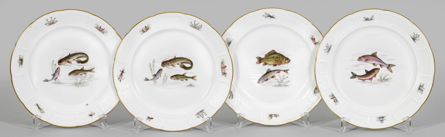 Vier Speiseteller mit Fischdekor Runde Form mit faconniertem Rand. Ozierrelief. Im leicht vertieften Spiegel naturalistische Darstellungen verschiedener Fischarten, u. a. Wels, Karpfen, Strömer, auf der Fahne Wasserpflanzen- und Insektenmotive in feiner polychromer Malerei. Goldrand. Rücks. Bez. der Fischarten. Ein Teller best.; Manufakturmarke. D. 24,5 cm.