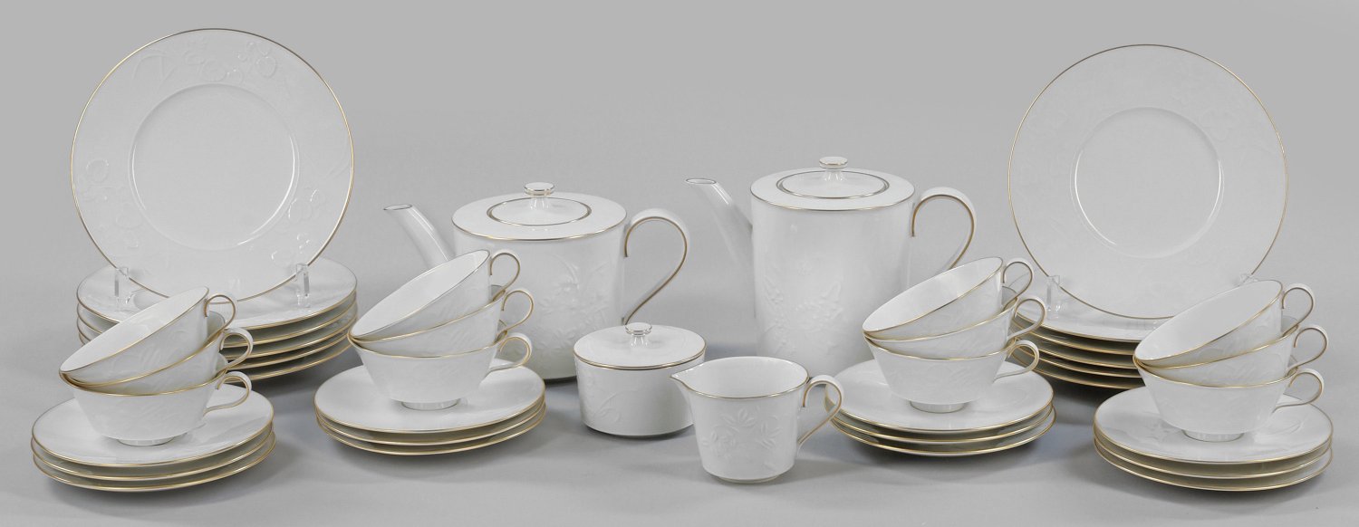 für 12 Personen. Weißporzellan. 28-tlg.; 2 Kannen, Sahnegießer, Zuckerdose, 12 Teetassen mit Untertassen, 12 Kuchenteller. Zarter Reliefdekor aus Gräsern und Wiesenblumen. Goldrand. Form-Entw. Trude Petri. Dekor-Entw. Gerhard Gollwitzer, 1941/42. Zepter- und grüne Malereimarke. Kannen-H. 14 cm - 16 cm.